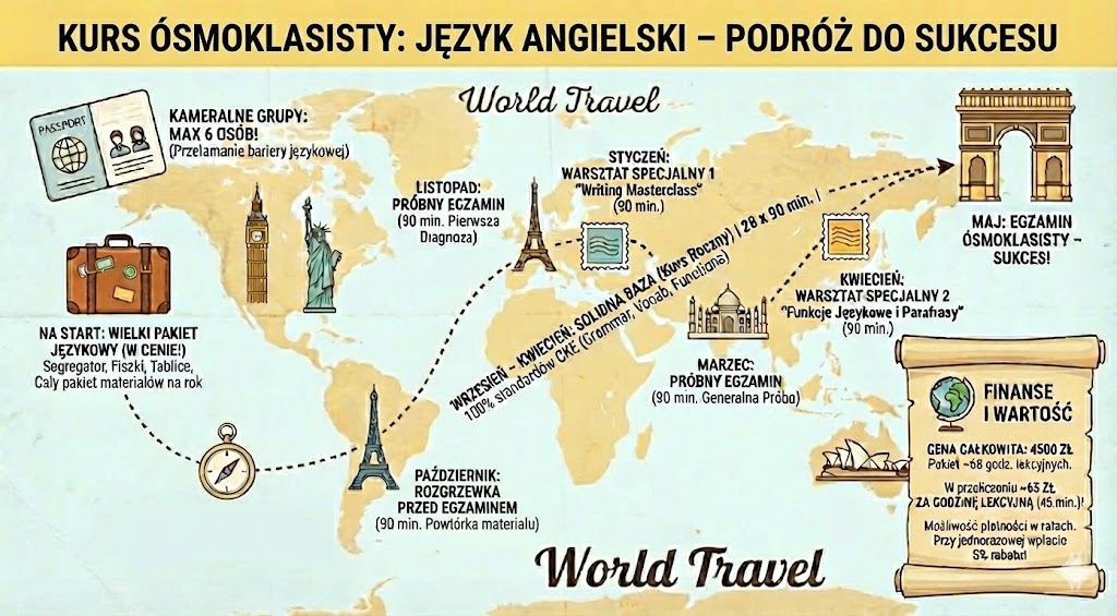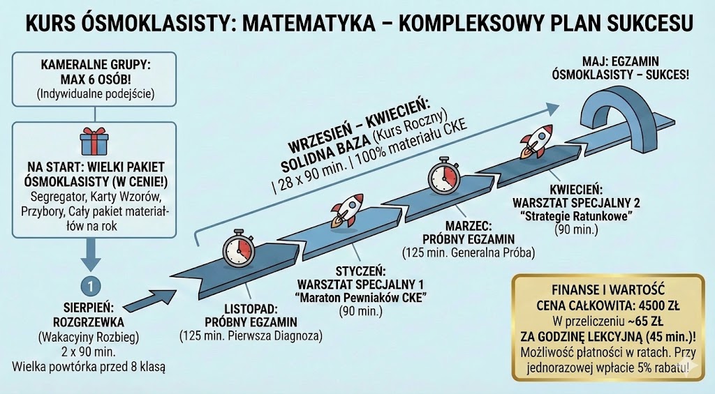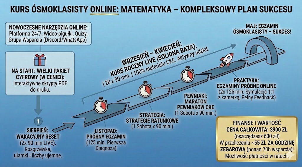 Twoje dziecko potrzebuje planu, a nie chaosu. Nasz kurs to kompletna ścieżka edukacyjna: od przypomnienia podstaw w sierpniu, przez systematyczną pracę w roku szkolnym, aż po strategiczne warsztaty tuż przed egzaminem.