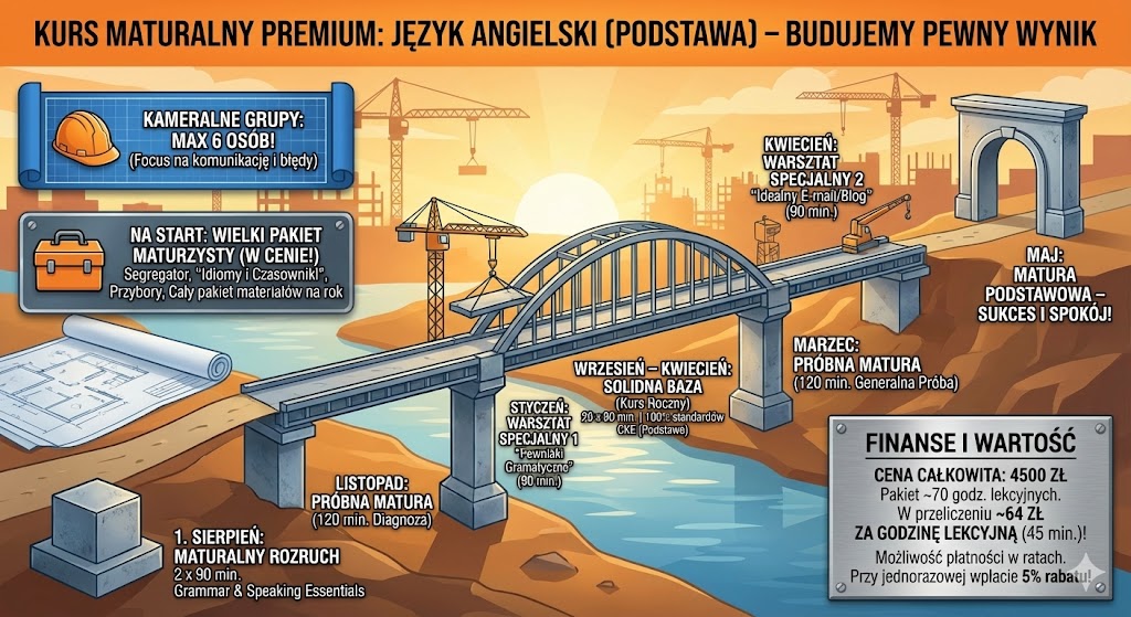 Matura podstawowa z angielskiego to dla wielu formalność, ale aby zdobyć 90-100%, nie można robić "głupich błędów". Nasz kurs eliminuje typowe pomyłki, systematyzuje gramatykę i uczy pisać wypracowania, które egzaminatorzy oceniają na maksimum punktów.