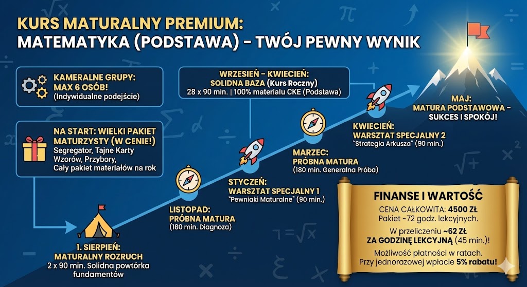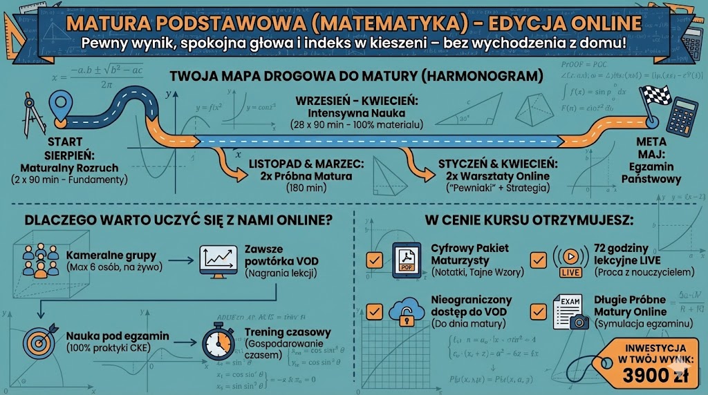 Pewny wynik, spokojna głowa i indeks w kieszeni – bez wychodzenia z domu!Matura z matematyki nie musi spędzać snu z powiek. Nasz kurs online na poziomie podstawowym to połączenie maksymalnej skuteczności z wygodą nauki we własnym pokoju. Zrozumiesz kluczowe schematy, opanujesz "pewniaki maturalne" i pójdziesz na egzamin z całkowitym spokojem. Celujemy wysoko, budując solidne fundamenty.
