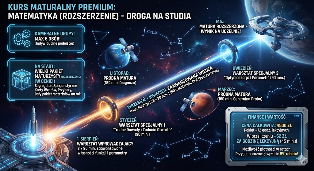 Wysoki wynik, otwarte drzwi na najlepsze uczelnie i wymarzone studia w kieszeni!Matura rozszerzona z matematyki to nie przelewki – to przepustka na najbardziej oblegane kierunki. Nasz kurs online został zaprojektowany dla osób, które chcą myśleć analitycznie, bezbłędnie punktować zadania otwarte i nie dać się zaskoczyć najtrudniejszym dowodom. Wchodzimy na wyższy poziom, szlifujemy detale i uczymy, jak myśleć schematami CKE.